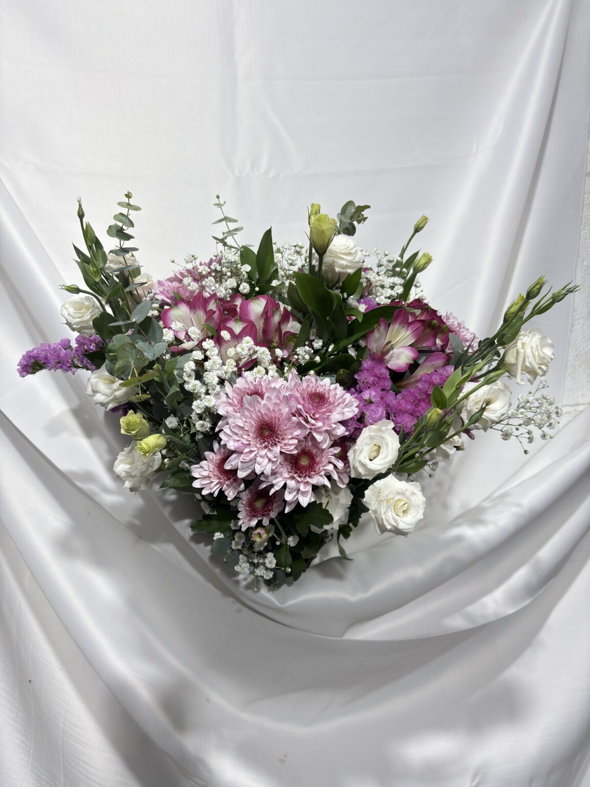 הזר מורכב מחרציות ורודות מלאות חיים, גיבסניות לבנות עדינות, ליזיאנטוס לבן אלגנטי ואסטרומריה לבנה בשילוב ורוד – יחד עם ענפי קישוט וירק שמעניקים עומק, תנועה ומראה טבעי מושלם. כל פרח תורם את האופי שלו, והתוצאה היא זר מרשים עם איזון מושלם בין עדינות לנוכחות.